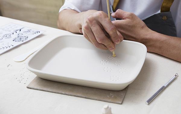 現場限量手作青瓷活動利用刻、壓、劃等技法,製作獨一無二的青瓷餐盤。燒製完成的青瓷餐盤,能使用於烤箱微波爐與洗碗烘碗機。